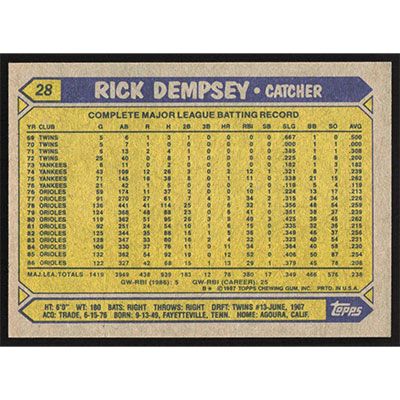 This is a 1987 Topps Rick Dempsey baseball card. The card is #28 and pictures show condition.