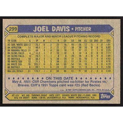 This is a 1987 Topps Joel Davis baseball card. The card is #299 and pictures show condition.