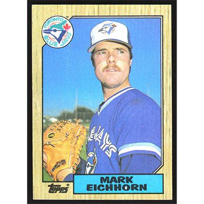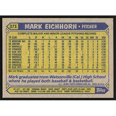 This is a 1987 Topps Mark Eichhorn baseball card. The card is #371 and pictures show condition.