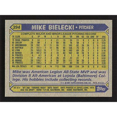 This is a 1987 Topps Mike Bielecki autographed baseball card. This card has been signed, in blue, by Mike Bielecki, and is guaranteed authentic by Ballcardz.com. The card is #394 and pictures show condition.