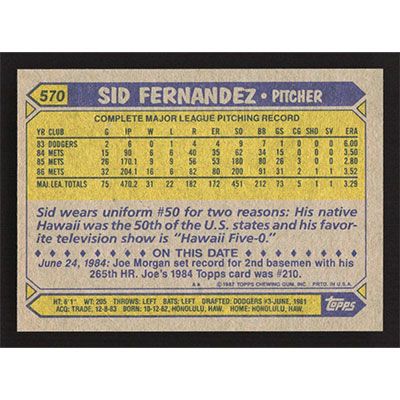 This is a 1987 Topps Sid Fernandez baseball card. The card is #570 and pictures show condition.
