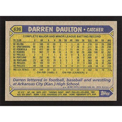 This is a 1987 Topps Darren Daulton baseball card. The card is #636 and pictures show condition.