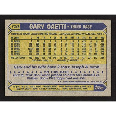 This is a 1987 Topps Gary Gaetti baseball card. The card is #710 and pictures show condition.