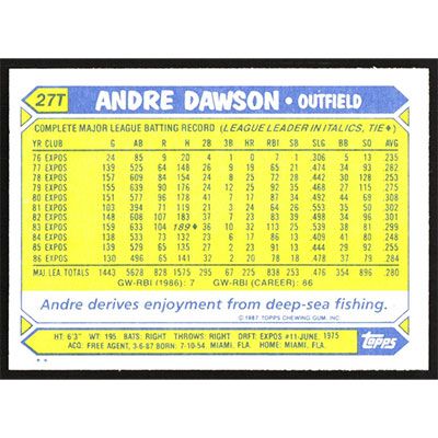 This is a 1987 Topps Traded Andre Dawson baseball card. The card is #27T and pictures show condition.