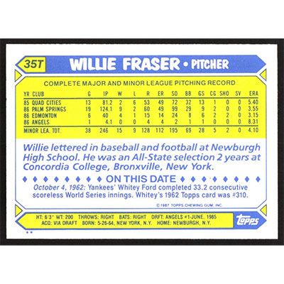 This is a 1987 Topps Traded Willie Fraser baseball card. The card is #35T and pictures show condition.