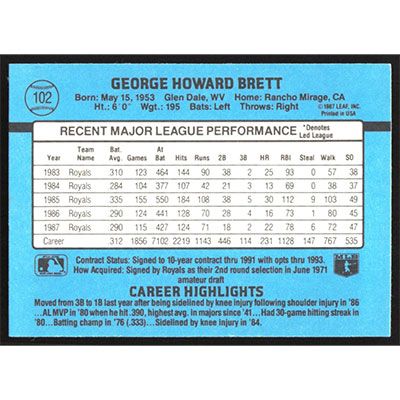 This is a 1988 Donruss George Brett baseball card. The card is #102 and pictures show condition.