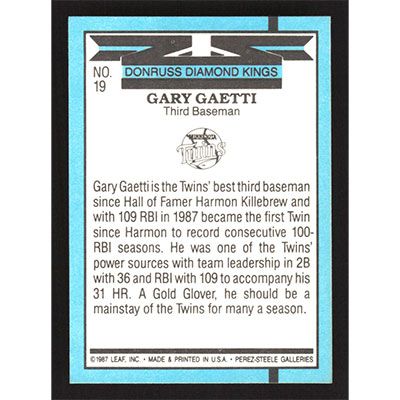 This is a 1988 Donruss Gary Gaetti Diamond Kings baseball card. The card is #19 and pictures show condition.