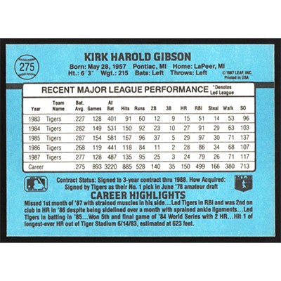 This is a 1988 Donruss Kirk Gibson baseball card. The card is #275 and pictures show condition.