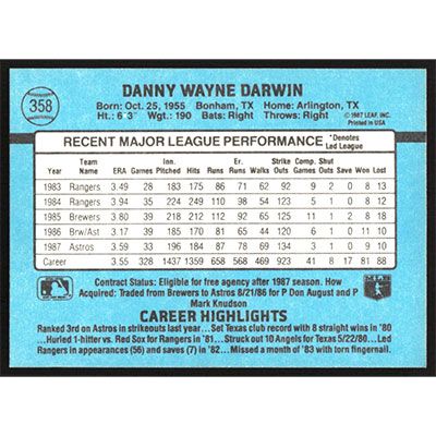 This is a 1988 Donruss Danny Darwin baseball card. The card is #358 and pictures show condition.