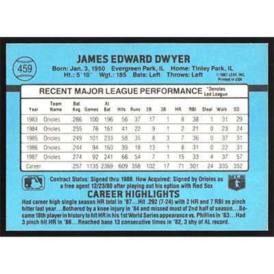 This is a 1988 Donruss Jim Dwyer baseball card. The card is #459 and pictures show condition.