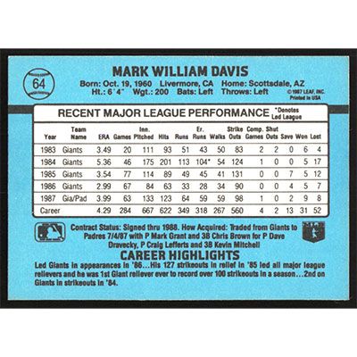 This is a 1988 Donruss Mark Davis baseball card. The card is #64 and pictures show condition.