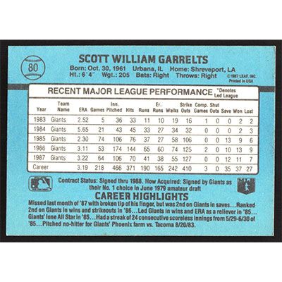 This is a 1988 Donruss Scott Garrelts baseball card. The card is #80 and pictures show condition.