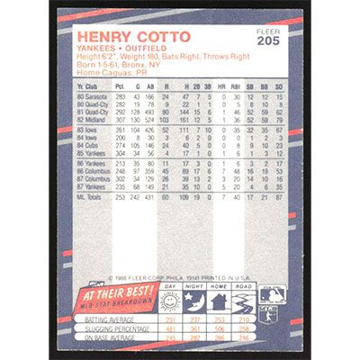 This is a 1988 Fleer Henry Cotto baseball card. The card is #205 and pictures show condition.