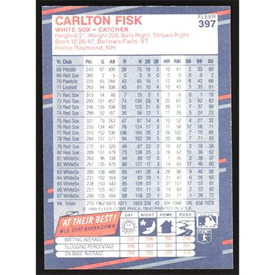 This is a 1988 Fleer Carlton Fisk baseball card. The card is #397 and pictures show condition.