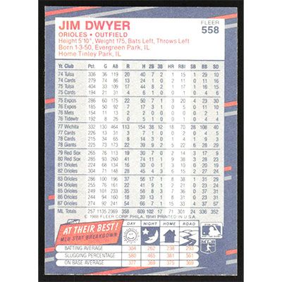 This is a 1988 Fleer Jim Dwyer baseball card. The card is #558 and pictures show condition.