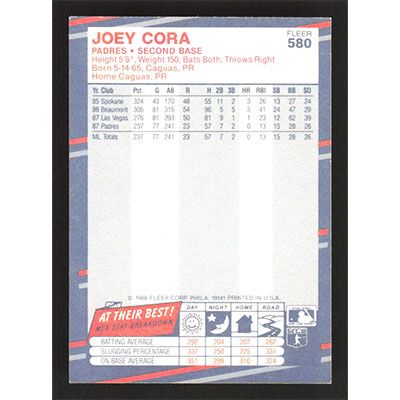 This is a 1988 Fleer Joey Cora baseball card. The card is #580 and pictures show condition.