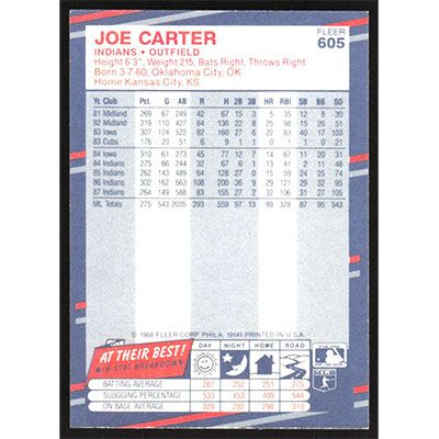 This is a 1988 Fleer Joe Carter baseball card. The card is #605 and pictures show condition.