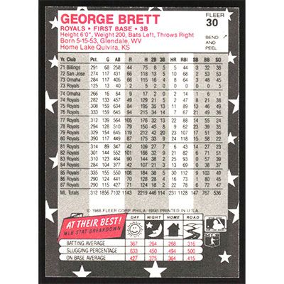 This is a 1988 Fleer Star Stickers George Brett baseball card. The card is #30 and pictures show condition.