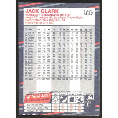 This is a 1988 Fleer Update Jack Clark baseball card. The card is #U-47 and pictures show condition.