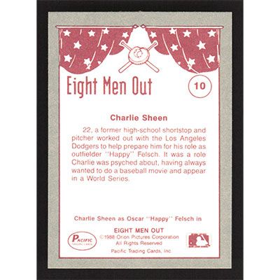 This is a 1988 Pacific Eight Men Out Charlie Sheen as Happy Felsch baseball card. The card is #10 and pictures show condition. Team(s): Chicago White Sox