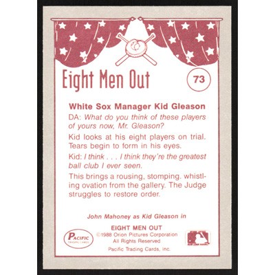 This is a 1988 Pacific Eight Men Out Kid Gleason "Kid Gleason take the stand." baseball card. The card is #73 and pictures show condition. Team(s): Chicago White Sox
