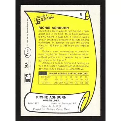 This is a 1988 Pacific Legends I Richie Ashburn baseball card. The card is #8 and pictures show condition.
