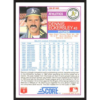 This is a 1988 Score Dennis Eckersley baseball card. The card is #104 and pictures show condition.