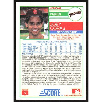 This is a 1988 Score Joey Cora baseball card. The card is #420 and pictures show condition.