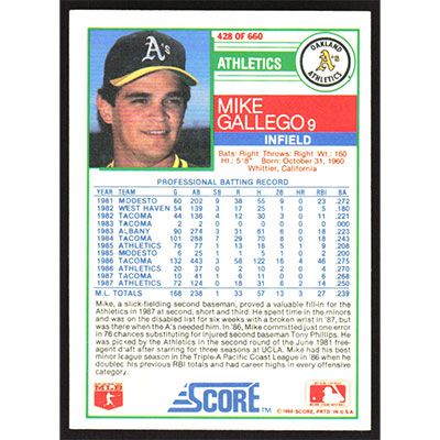 This is a 1988 Score Mike Gallego baseball card. The card is #428 and pictures show condition.