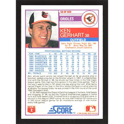 This is a 1988 Score Ken Gerhart baseball card. The card is #58 and pictures show condition.