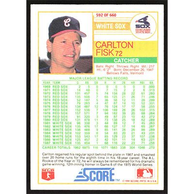This is a 1988 Score Carlton Fisk baseball card. The card is #592 and pictures show condition.