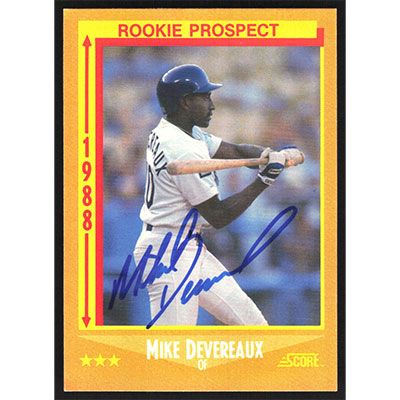 This is a 1988 Score Mike Devereaux autographed baseball card. This card has been signed, in blue, by Mike Devereaux, and is guaranteed authentic by Ballcardz.com. The card is #637 and pictures show condition.