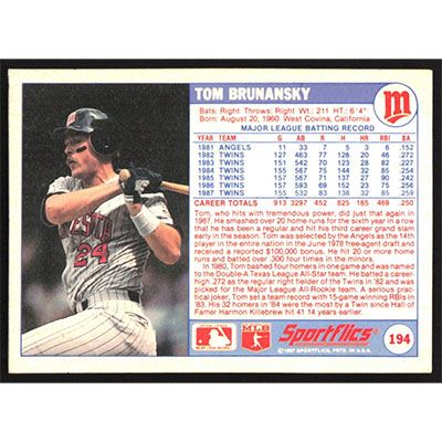 This is a 1988 Sportflics Tom Brunansky baseball card. The card is #194 and pictures show condition.