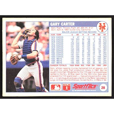 This is a 1988 Sportflics Gary Carter baseball card. The card is #28 and pictures show condition.