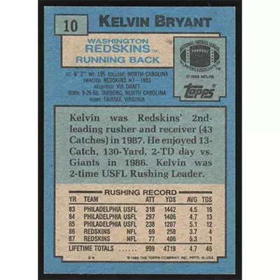 This is a 1988 Topps Kelvin Bryant football card. The card is #10 and pictures show condition.
