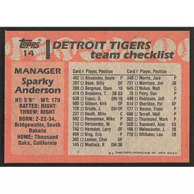 This is a 1988 Topps Sparky Anderson Team Checklist baseball card. The card is #14 and pictures show condition.