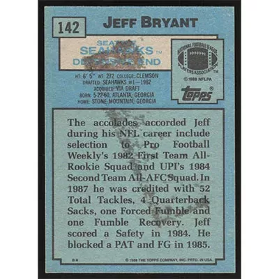 This is a 1988 Topps Jeff Bryant Gum Stain football card. The card is #142 and pictures show condition.