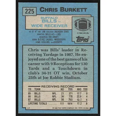 This is a 1988 Topps Chris Burkett football card. The card is #225 and pictures show condition.