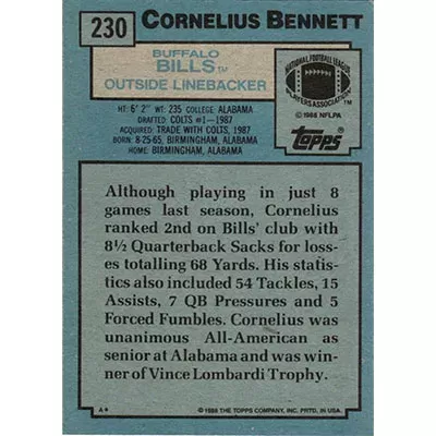 This is a 1988 Topps Cornelius Bennett Super Rookie football card. The card is #230 and is in NM-MT condition.