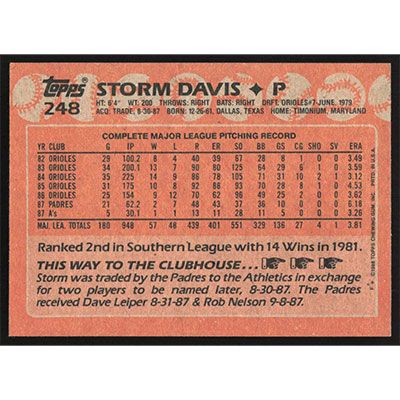 This is a 1988 Topps Storm Davis baseball card. The card is #248 and pictures show condition.