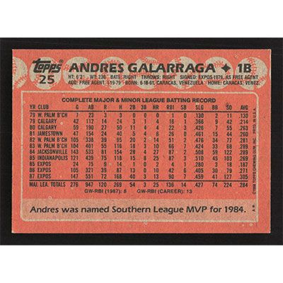 This is a 1988 Topps Andres Galarraga baseball card. The card is #25 and pictures show condition.