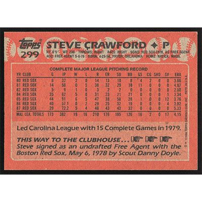 This is a 1988 Topps Steve Crawford baseball card. The card is #299 and pictures show condition.