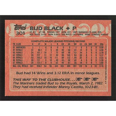This is a 1988 Topps Bud Black baseball card. The card is #301 and pictures show condition.