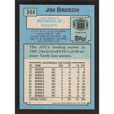 This is a 1988 Topps Jim Breech football card. The card is #344 and pictures show condition.