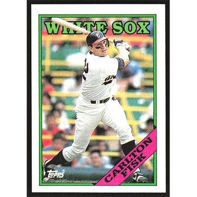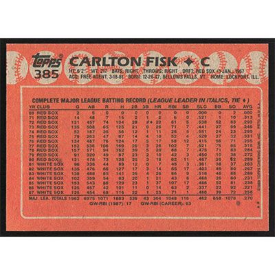 This is a 1988 Topps Carlton Fisk baseball card. The card is #385 and pictures show condition.