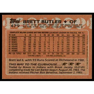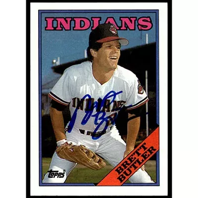 This is a 1988 Topps Brett Butler autographed baseball card. This card has been signed, in blue, by Brett Butler, and is guaranteed authentic by Ballcardz.com. The card is #479 and is in NM-MT condition.