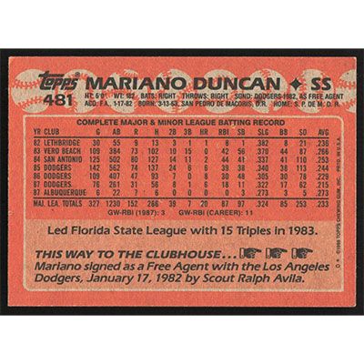 This is a 1988 Topps Mariano Duncan baseball card. The card is #481 and pictures show condition.