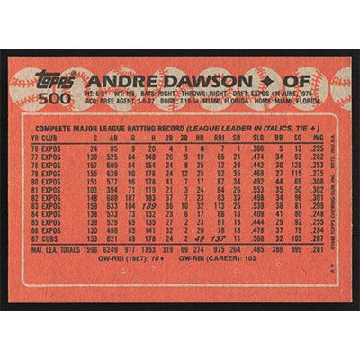 This is a 1988 Topps Andre Dawson baseball card. The card is #500 and pictures show condition.