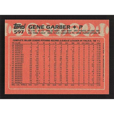 This is a 1988 Topps Gene Garber baseball card. The card is #597 and pictures show condition.