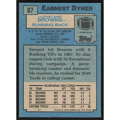This is a 1988 Topps Earnest Byner football card. The card is #87 and pictures show condition.